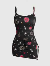 Goth Vestido camisero de talla grande con cordón, plisado y bajo asimétrico con estampados de corazón, estrella, telaraña y escorpión en estilo gótico