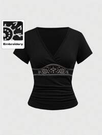 Goth Camiseta ajustada de Body con contraste de encaje y cintura fruncida, versátil y sexy para mujeres
