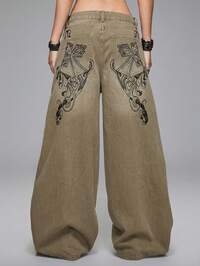 Grunge Punk Jeans anchos y sueltos con lavado vintage, bordado de mariposa y efecto desgastado estilo punk Y2K