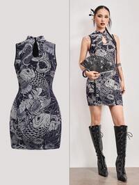 ROMWE Avant Vestido mini cheongsam de malla con estampado de carpa y floral retro de estilo chino para mujer