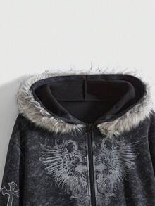 Fairycore Sudadera con capucha con cremallera cruzada y cuello de mujer, con lavado desgastado y aplicaciones de rhinestones