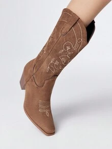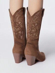 Fairycore Botas vaqueras marrones para mujer, botas occidentales de ante sintético con bordados de estilo casual al aire libre, de media pantorrilla, para primavera/otoño
