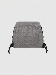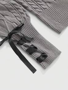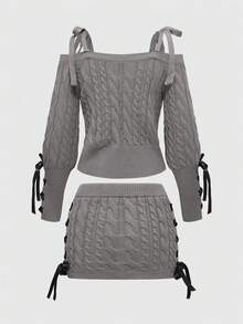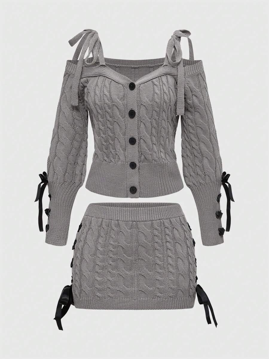 Kawaii Conjunto de 2 piezas de suéter de punto de manga farol con cuello en V y lazo, y falda cruzada A-line para mujer