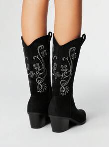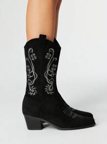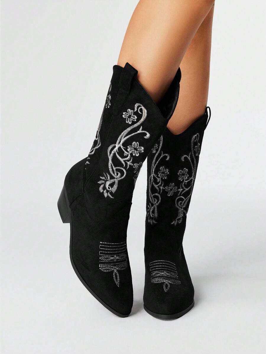 Goth Botas vaqueras para mujer, botas occidentales negras de tacón grueso con punta puntiaguda y bordados, nuevas llegadas para primavera/otoño