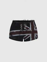 Grunge Punk Pantalones cortos capri de mezclilla holgados con estampado de bandera británica, números y letras en inglés, en estilo retro de motocicleta callejera, para talla grande y vuelta al colegio