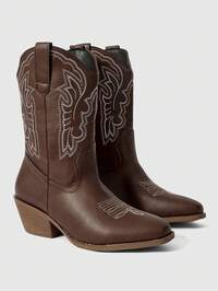 Goth Botas de vaquera para mujer, color marrón café, moda puntera puntiaguda, tacón grueso con bordado, botas western, nuevos llegados para primavera/otoño