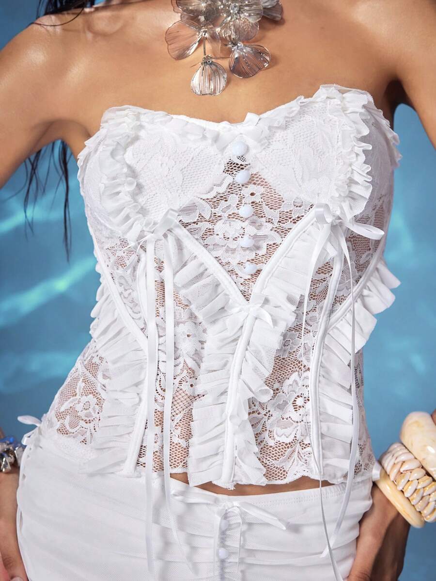 Fairycore Conjunto de 2 piezas de top de camisola de encaje de unicolor elegante y minifalda para mujer, para verano