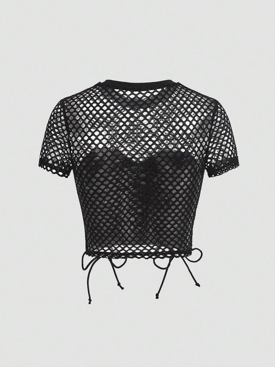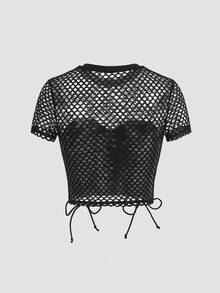 Blusa de mujer con diseño de contraste de color, parches de red y cruzado con lazo delantero
