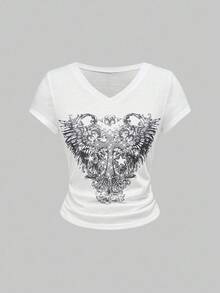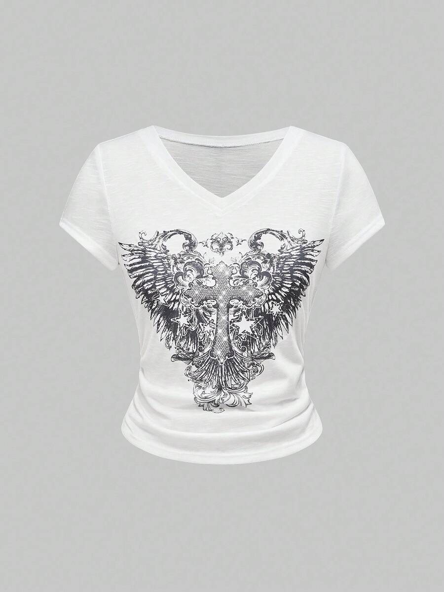 Fairycore Camiseta de manga corta con estampado de cruz y alas, de moda callejera para mujer, de verano