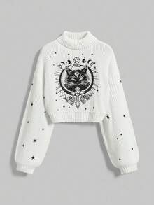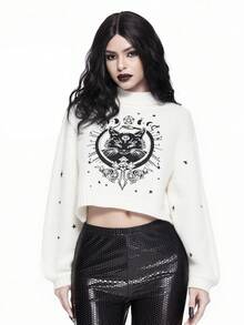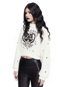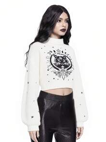 Goth Suéter de cuello alto negro gótico oscuro con bordado misterioso de gato para mujer