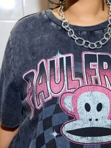 Paul Frank X ROMWE Camiseta de manga corta con estampado de letras y cuadros retro Y2K para mujer talla grande