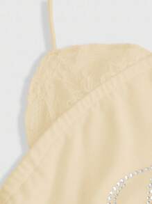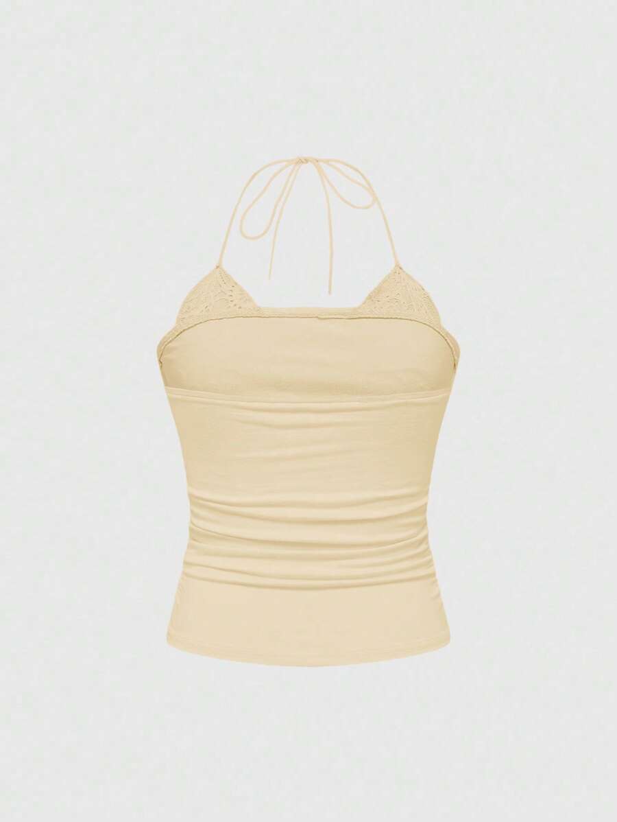 Camiseta de mujer con cuello halter con adornos de strass y dobladillo de encaje plisado 2 en 1