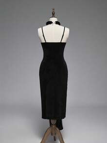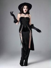 Goth Vestido ajustado de terciopelo con abertura alta, estilo gótico vintage punk para mujer, con encaje y parches de encaje