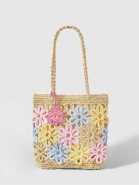 Kawaii Bolso de hombro de mujer de estilo de vacaciones con flor y estrella de mar tejida, de unicolor y de moda