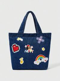 Kawaii 1 pieza Bolso de tela con bordado lindo de corazón de píxeles, arcoíris, perro feliz, nota musical, estrella, gran capacidad para ir al trabajo, estilo japonés/coreano para mujeres