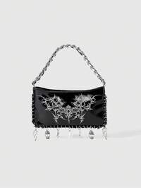 Grunge Punk Bolso de hombro elegante de mujer con bordado de flores oscuras y florales, con aplicaciones de cristal de estilo gótico y edgy, para Halloween