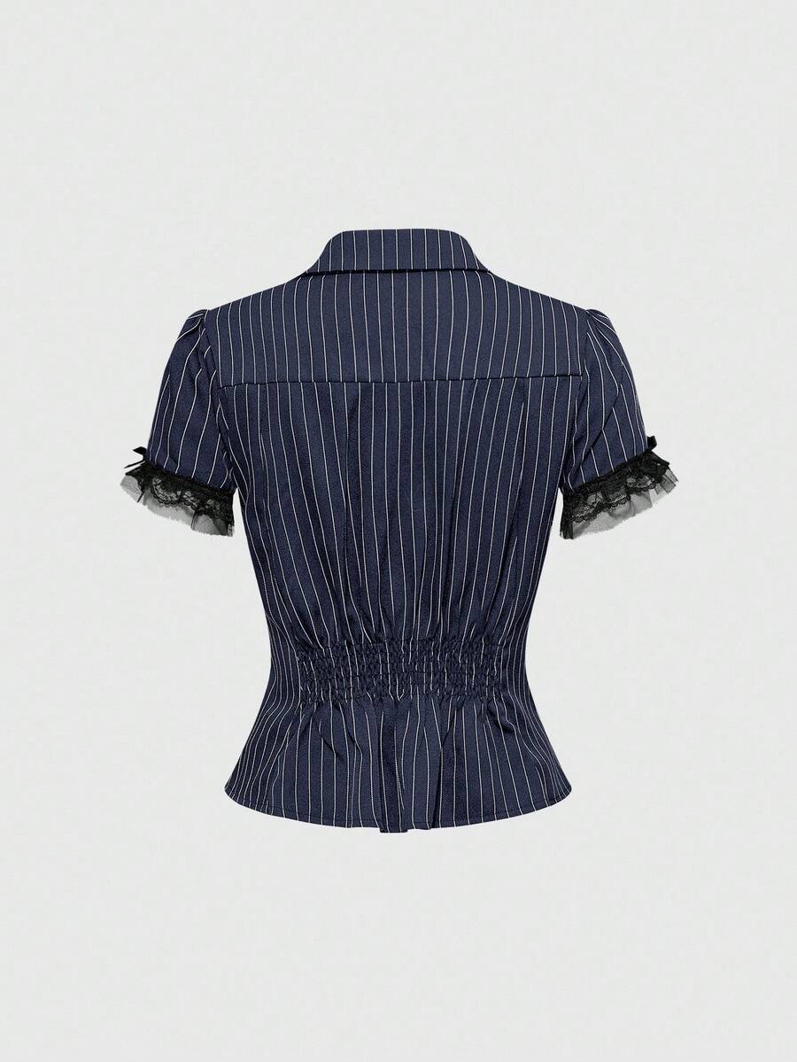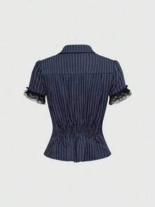 Grunge Punk Blusa de mujer de manga corta con cintura ajustada, parches de encaje y rayas