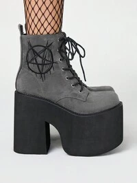 Grunge Punk Botas de tobillo con suela gruesa y cordones para mujer, botas de plataforma con tacón grueso de estilo gótico punk con patrón bordado