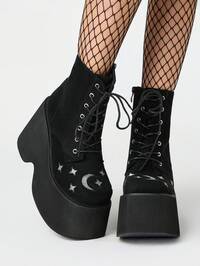 Grunge Punk Botas de tobillo con plataforma y tacón súper alto para mujer, estilo punk y2k con punta cuadrada, bordado de estrellas y lunas, cordones y suela gruesa, adecuadas para actuaciones en el escenario con tacones de cuña