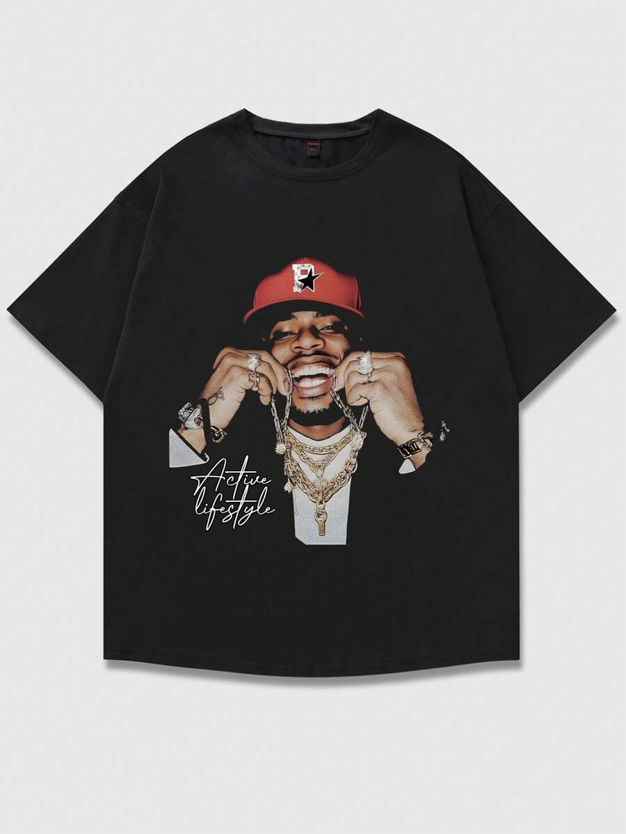 Street Life Camiseta gráfica con talla grande para mujer con estilo callejero estadounidense, retrato personalizado de hip-hop y estampado de texto en inglés