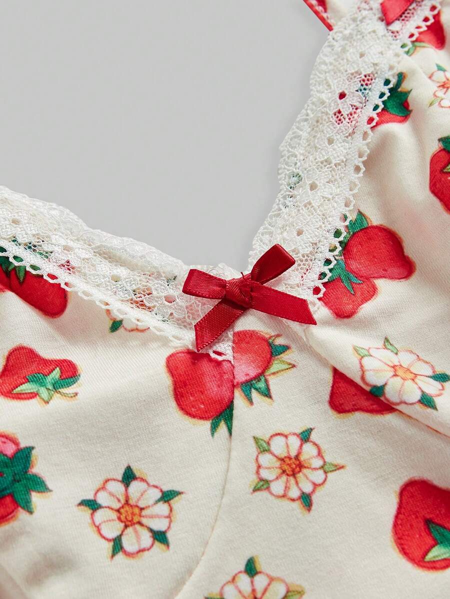 Top de tirantes con estampado de frambuesa crujiente y encaje de contraste para mujer