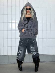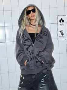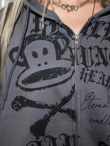 Paul Frank X ROMWE Sudadera con capucha con cremallera y estampado de mono oversize Y2K para mujer