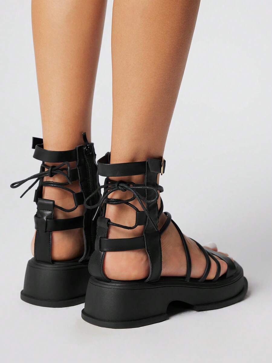 Goth Zapatos de tacón alto negros para mujer, sandalias romanas de playa de verano con punta abierta y cremallera trasera, sandalias de plataforma de estilo gótico con tacón grueso, para Halloween