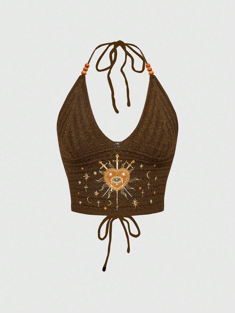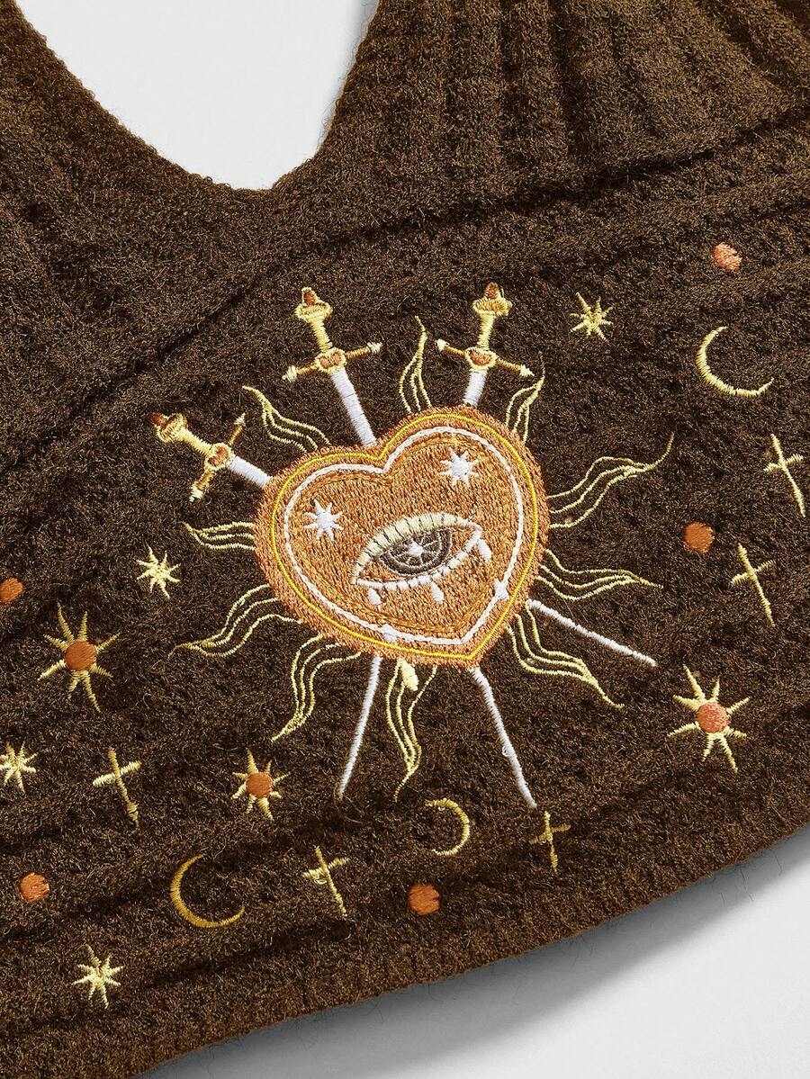 Blusa de punto negra con bordado de corazón, luna y estrella, estilo bohemio, gótico e hippie para vacaciones