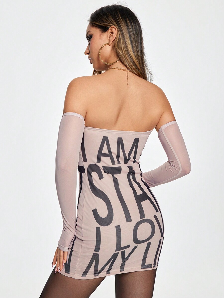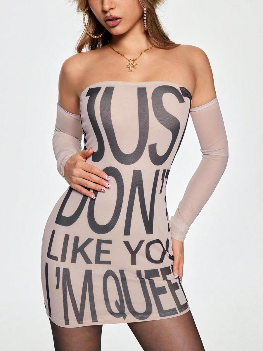 Vestido mini ajustado de mujer de moda con hombros descubiertos, estampado de lema y malla transparente