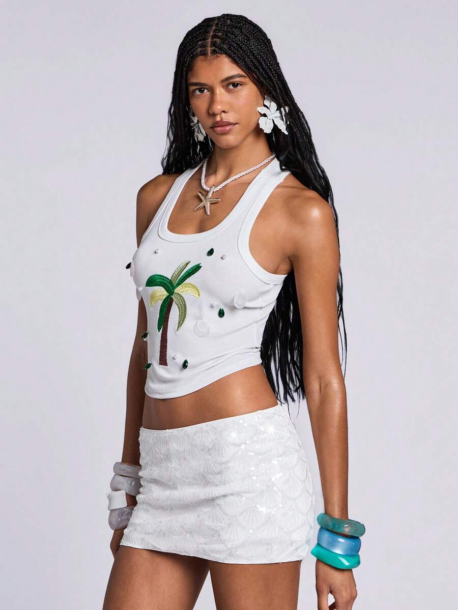 Minifalda de cintura baja con bordado y cuentas de concha para mujer