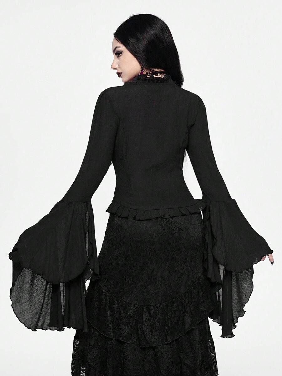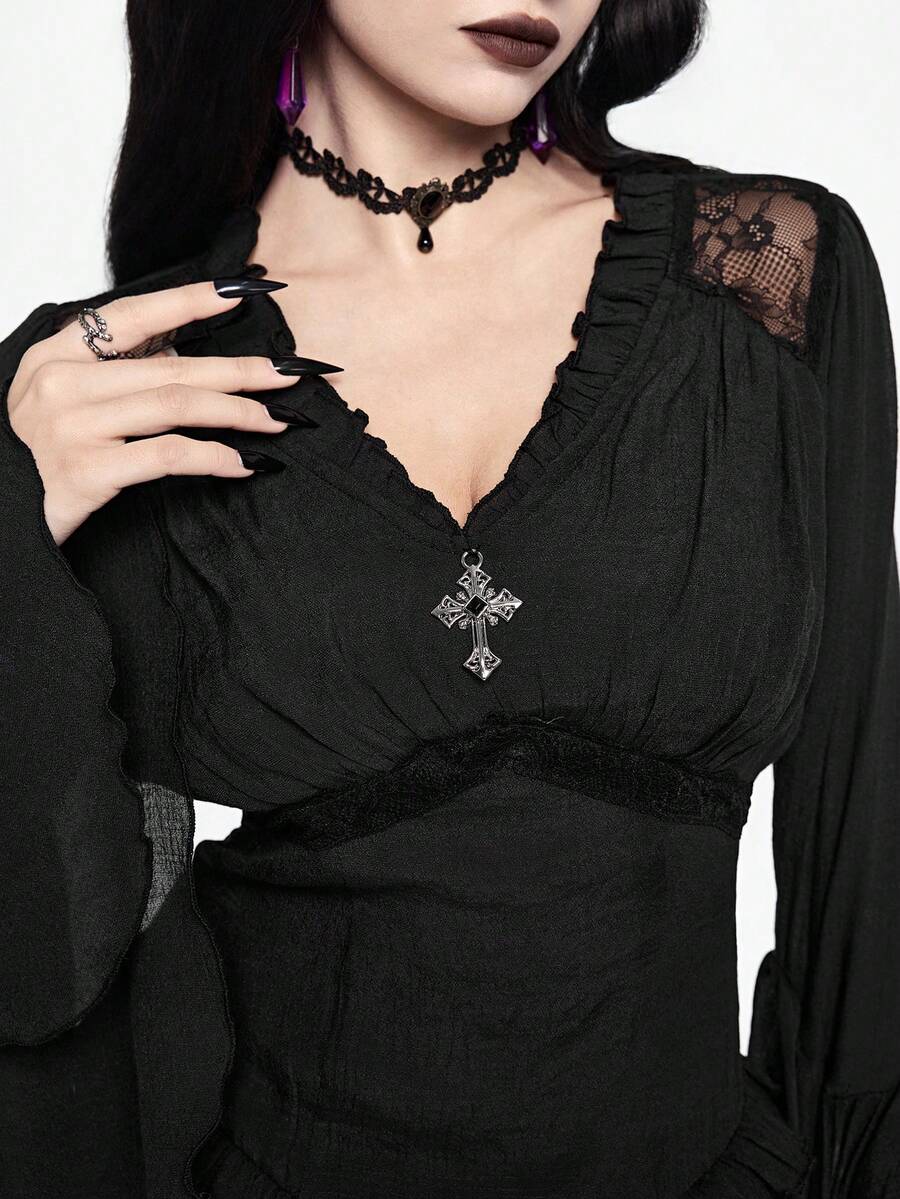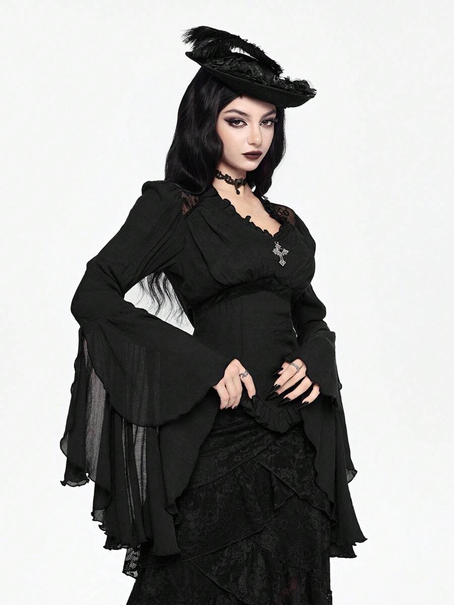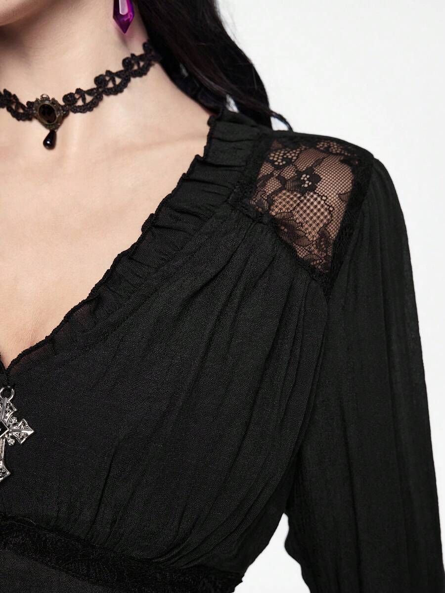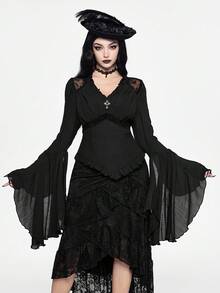 Camisa casual de mujer con cuello en V profundo, contraste de encaje y mangas acampanadas, estilo gótico palaciego, para Halloween