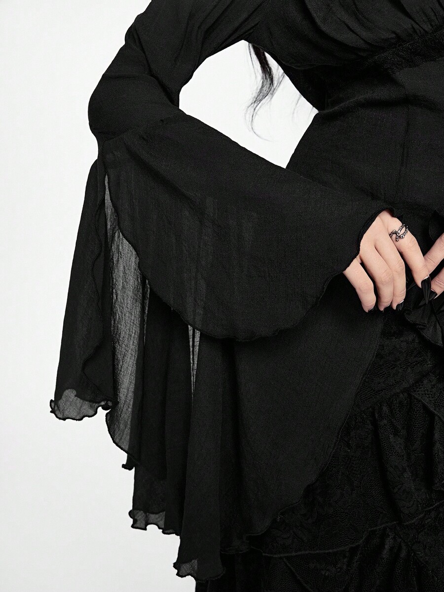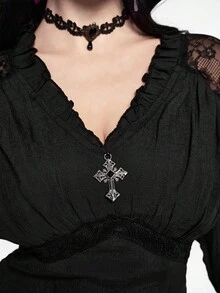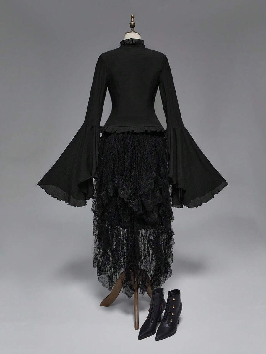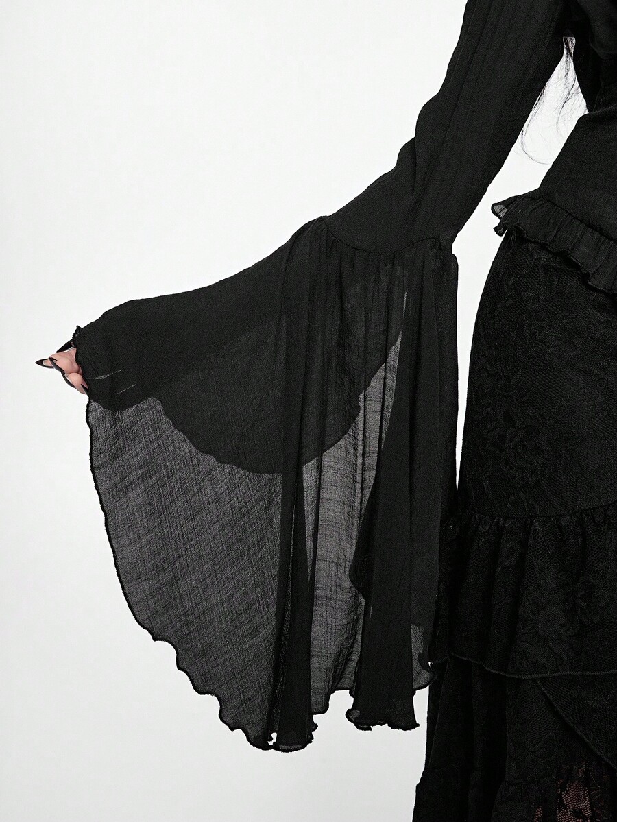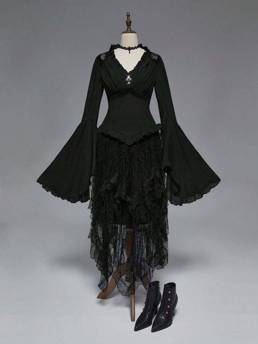 Camisa casual de mujer con cuello en V profundo, contraste de encaje y mangas acampanadas, estilo gótico palaciego, para Halloween