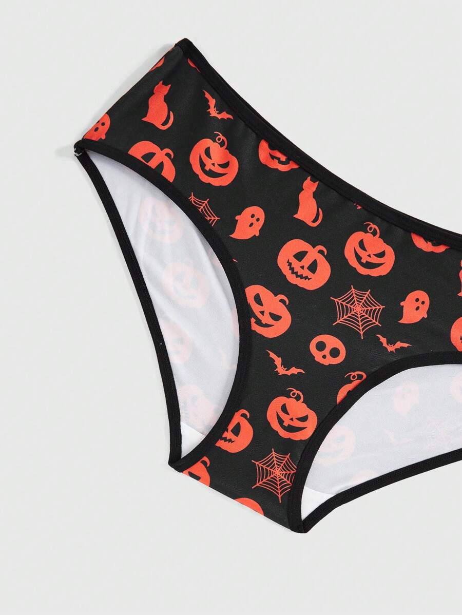 Pantis triángulo con estampado completo de calavera, calabaza, araña y murciélago para mujer, paquete de 3