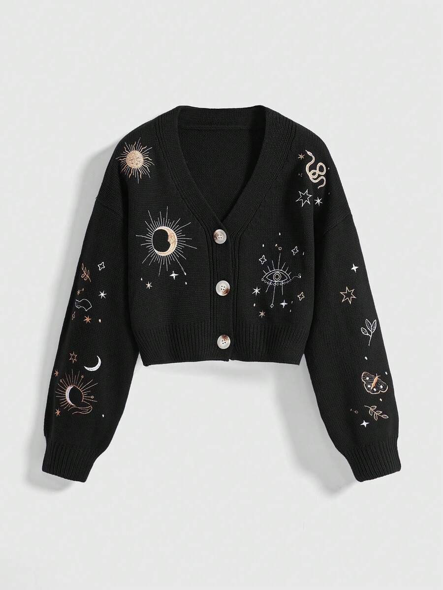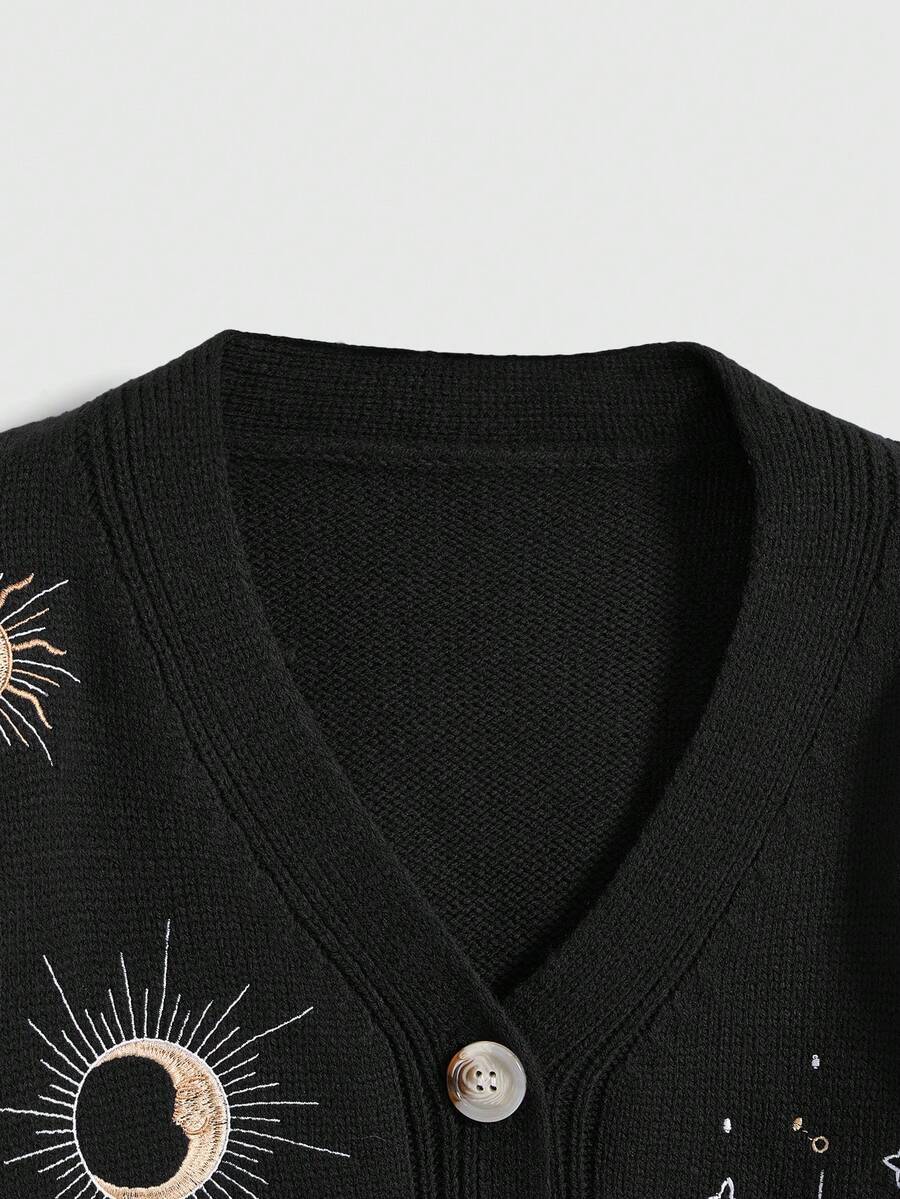 Cárdigan de mujer con bordados de sol, luna, estrella y serpiente en estilo hippie