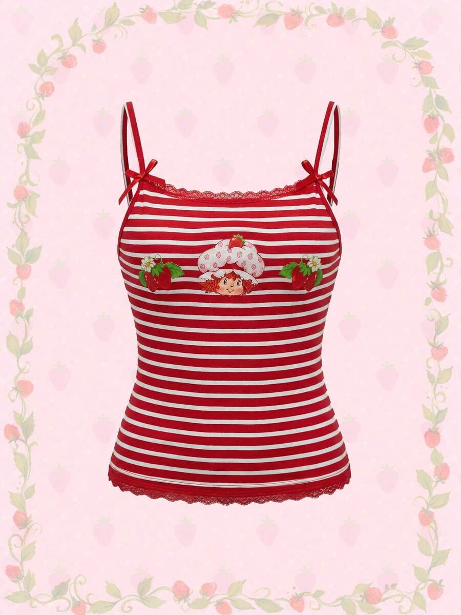 Camiseta de tirantes de mujer con estampado de fresas, encaje y rayas de contraste, de moda para el verano