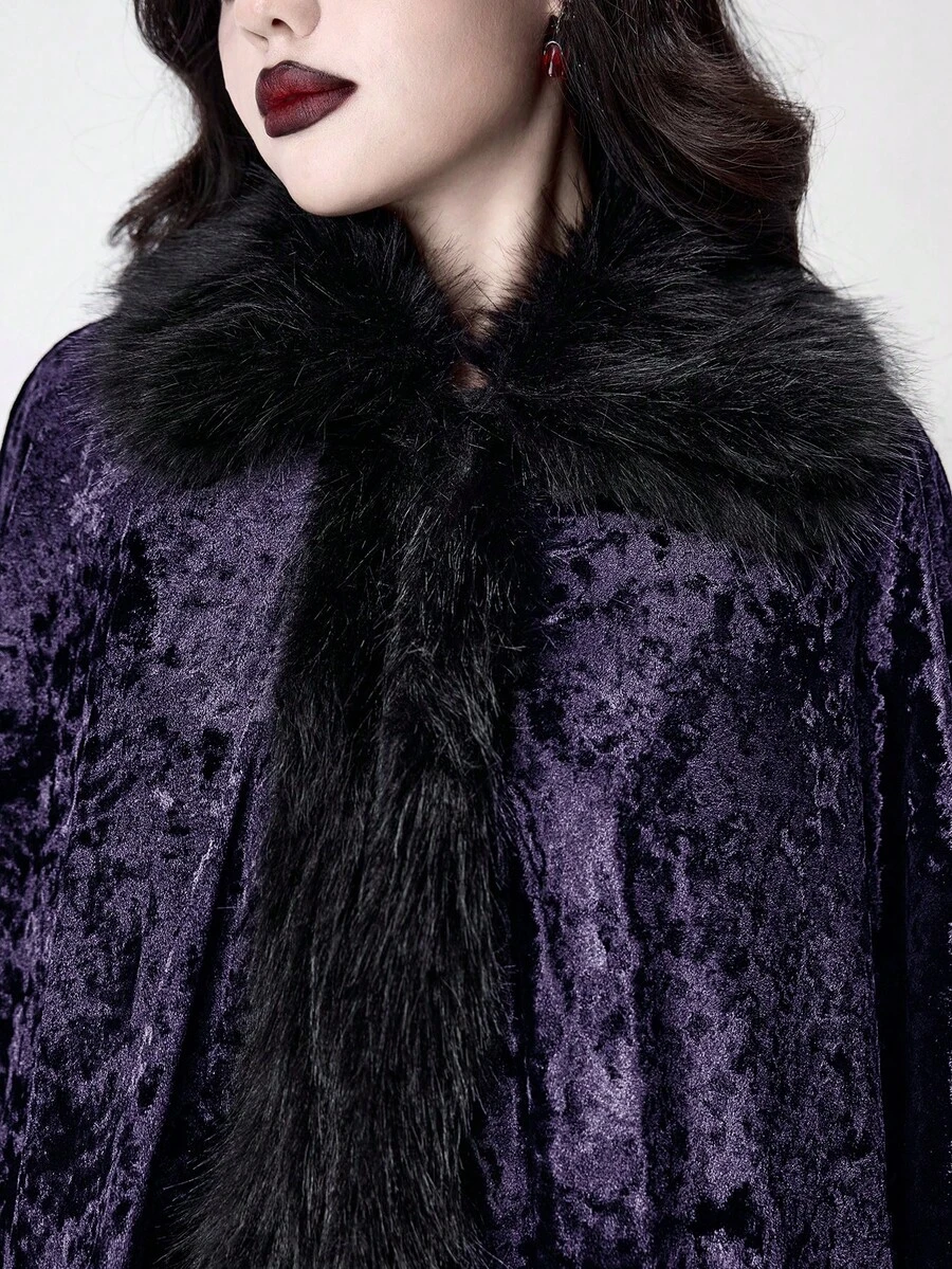 Goth Capa gótica de mujer con cuello de piel sintética de estilo palaciego, patchwork, adornos de diamantes y encaje de terciopelo