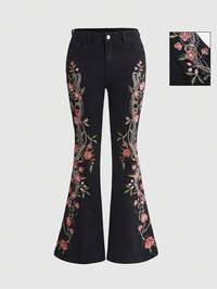 J-Fashion Jeans de mezclilla con bordado floral vintage para mujer