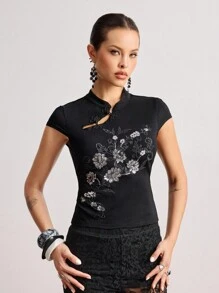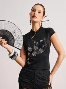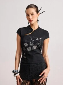 ROMWE Avant Top ajustado para mujer con cuello alto, bordado con cuentas y estilo chino Y2K