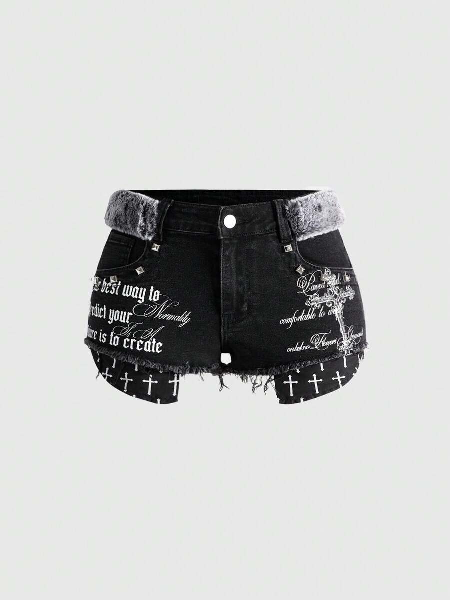 J-Fashion Shorts vaqueros mini de tiro bajo con decoración de cruz y remaches, estilo retro chic, para mujer, Y2K K-pop, otoño/invierno