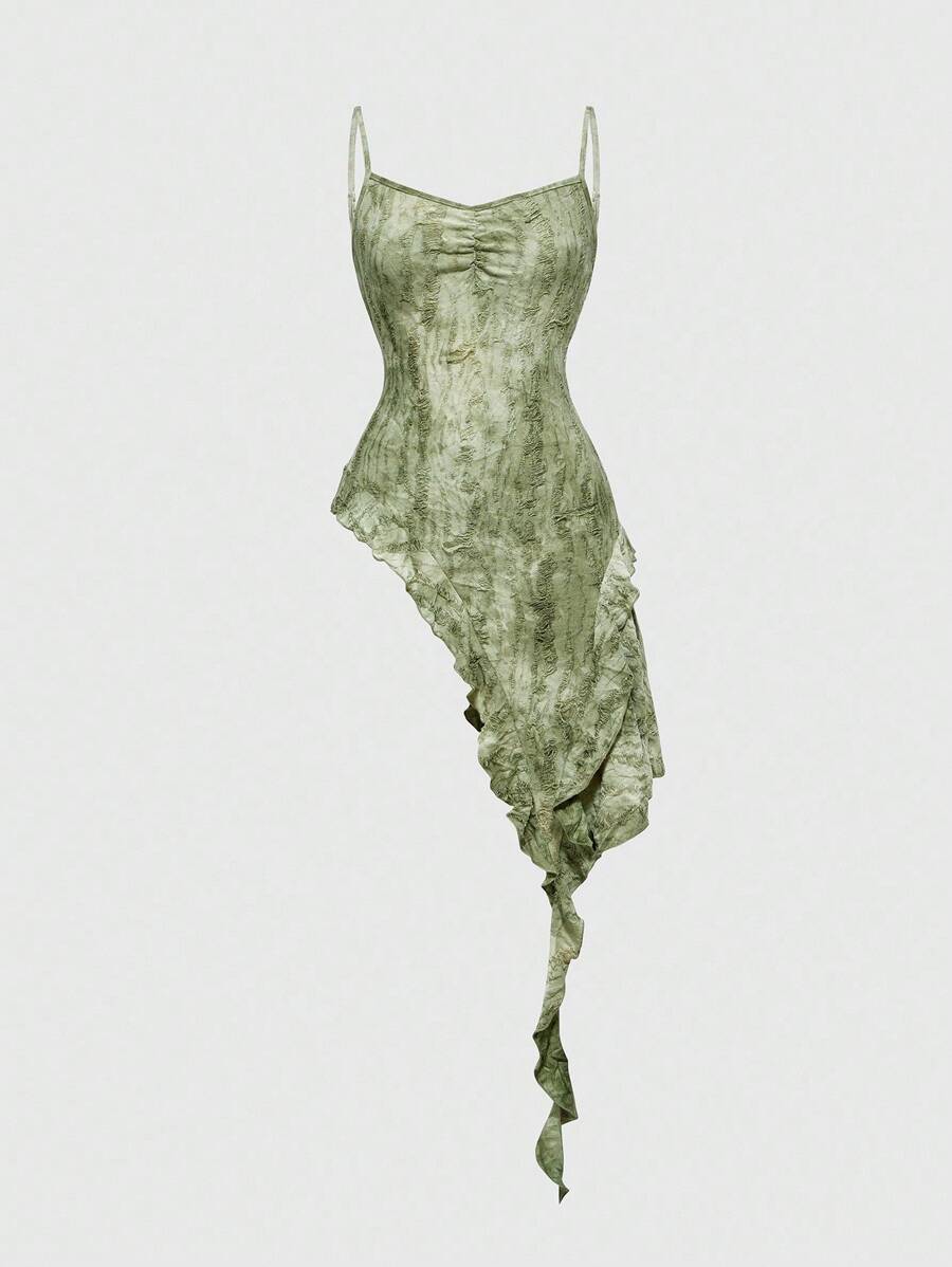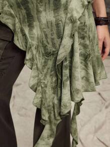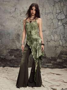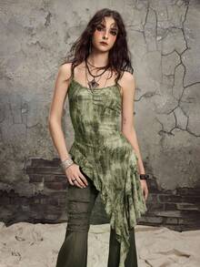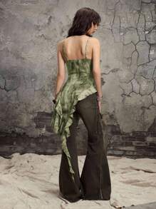Grunge Punk Camiseta de mujer con diseño de volantes asimétricos y efecto tie-dye desgastado, estilo Y2K