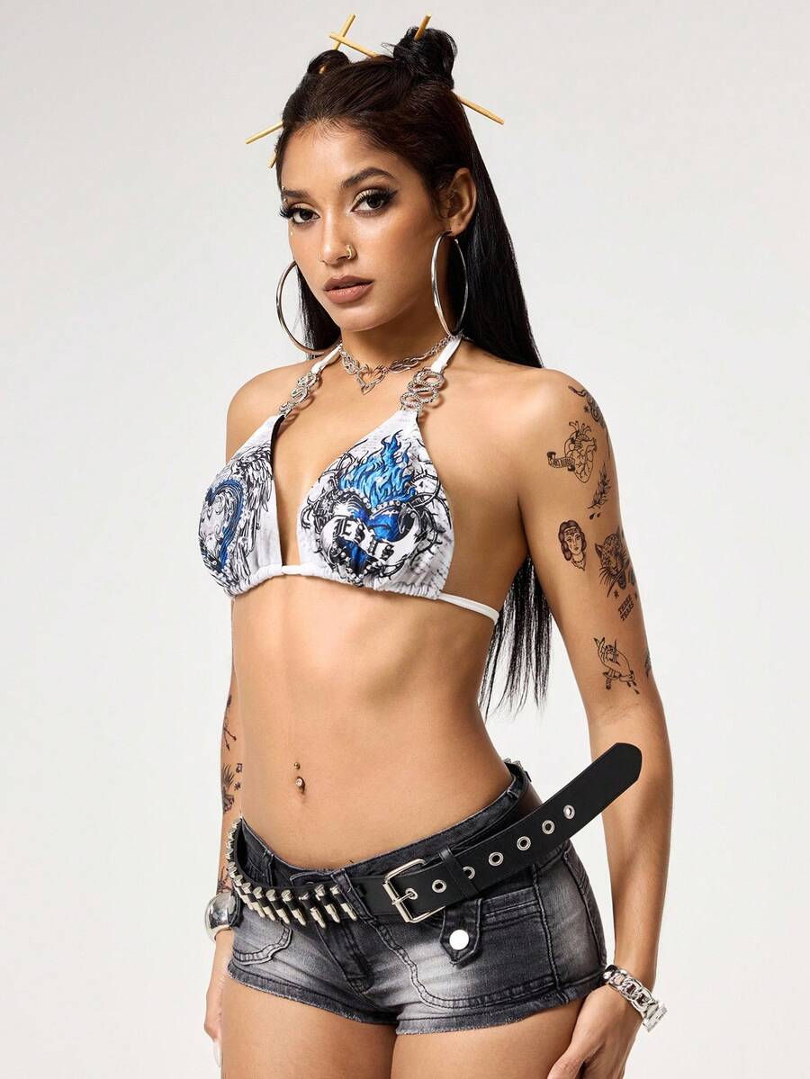 Top tipo camiseta de bikini con estampado de corazón y alas de cristal, estilo punk Y2K