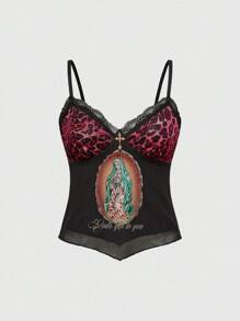 Fairycore Camiseta de tirantes con estampado de leopardo, encaje y aplicaciones de strass en estilo Y2K de Santa María