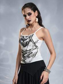 Top ajustado de estilo vacacional sexy Y2K para mujeres con cadena de cuentas, estampado de puntos de tinta y cruz