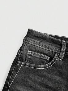 Grunge Punk Minifalda de mezclilla elástica con bordado de calavera en el bolsillo, pespuntes de contraste y tachuelas, estilo Y2K (con leggings) para mujeres
