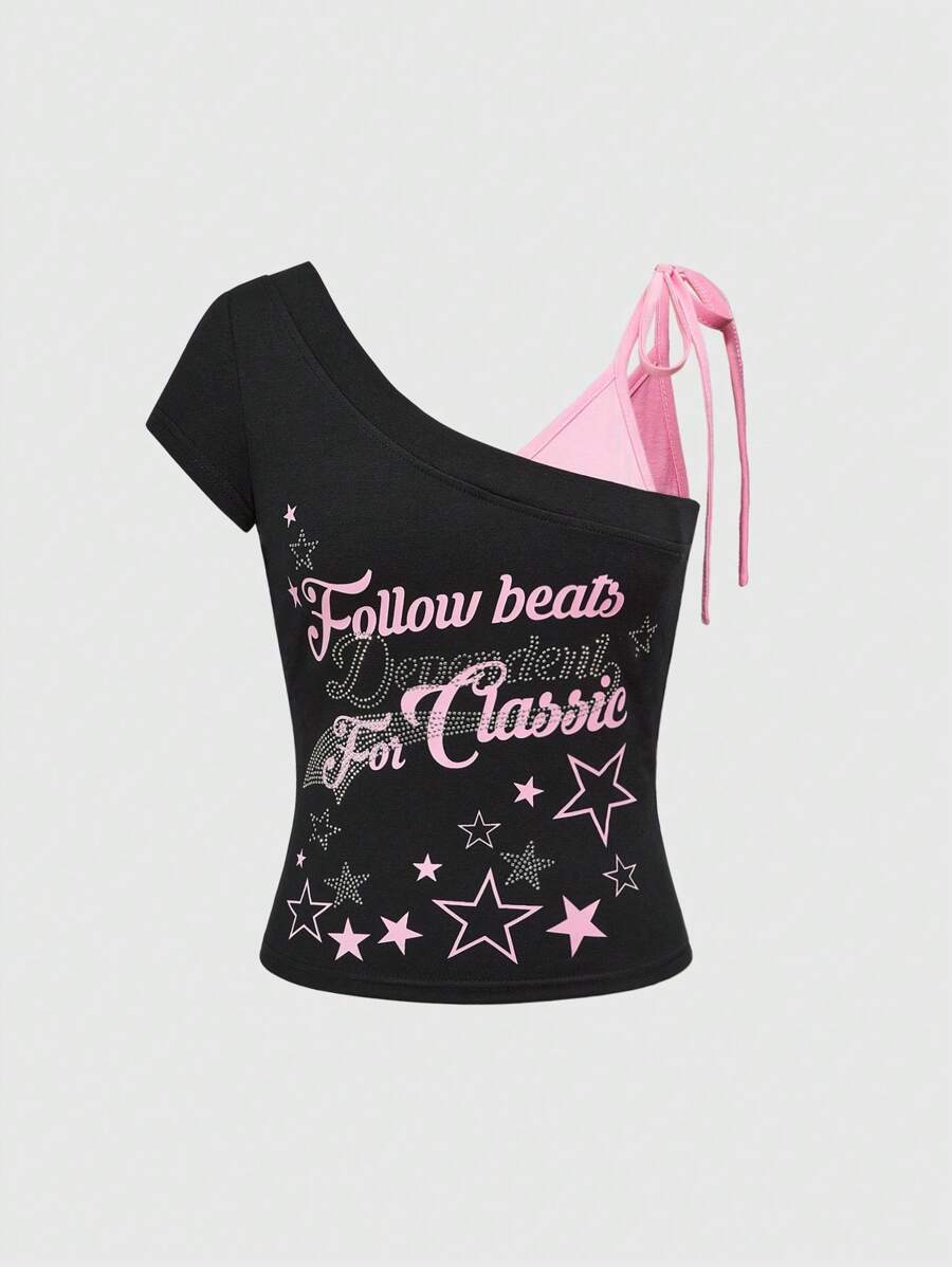 Blusa corta con aplicaciones de strass con hombro asimétrico con estilo Y2K, ajustada, inspirada en el vintage de color rosa fucsia