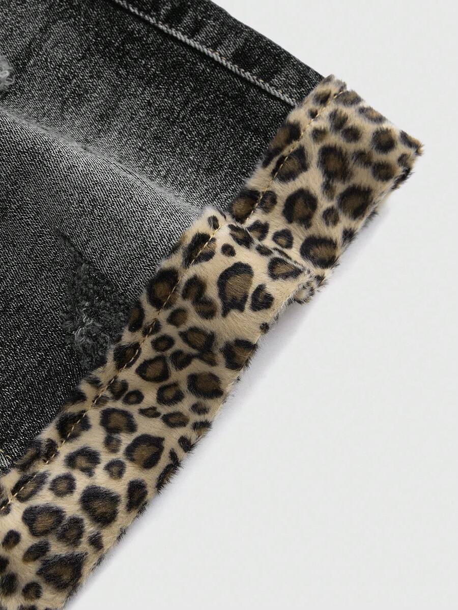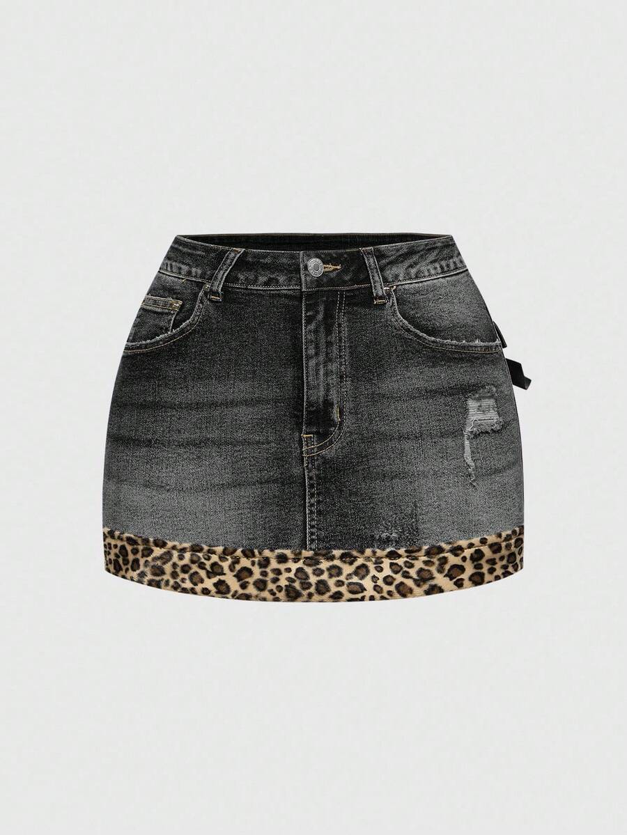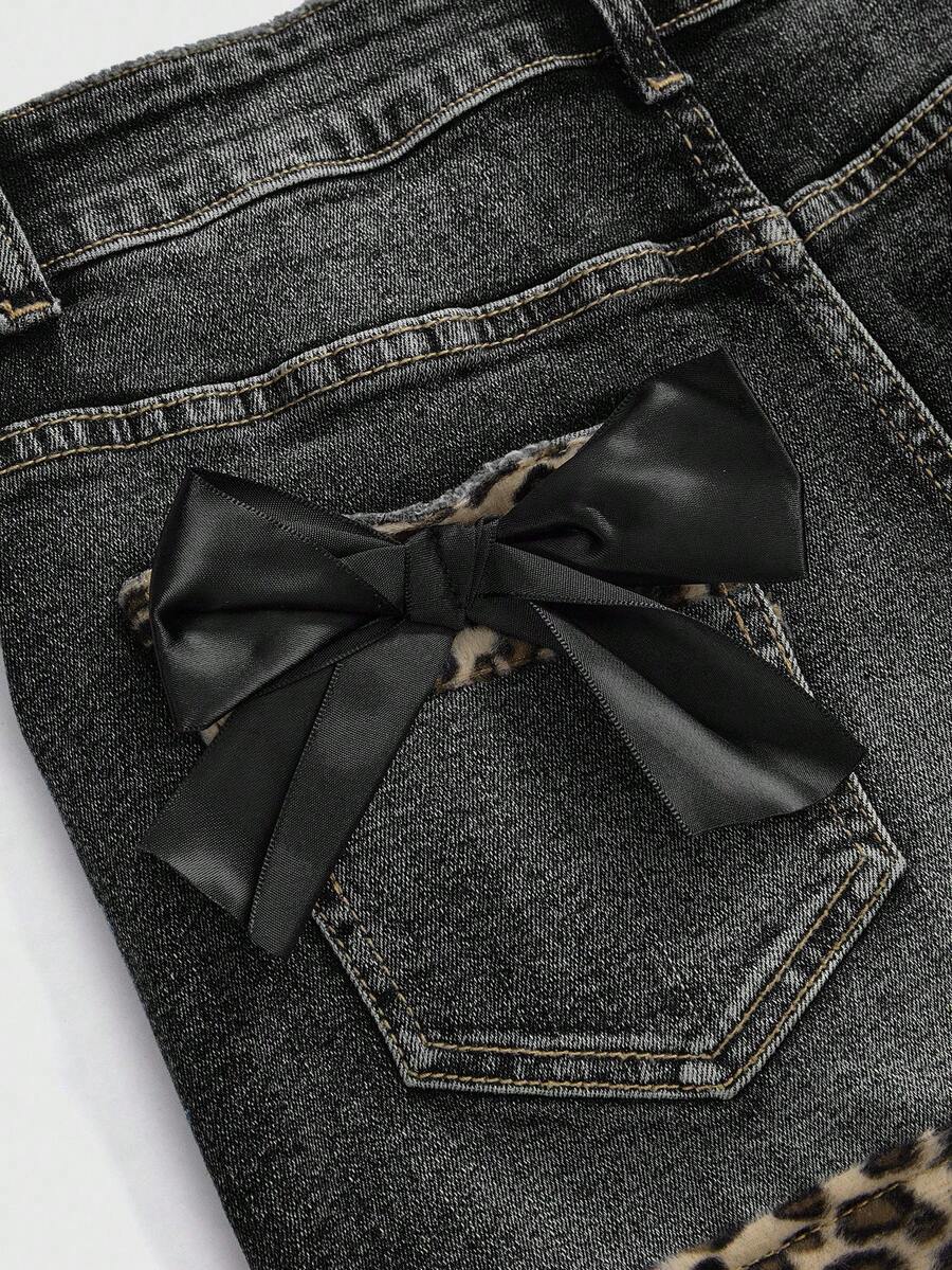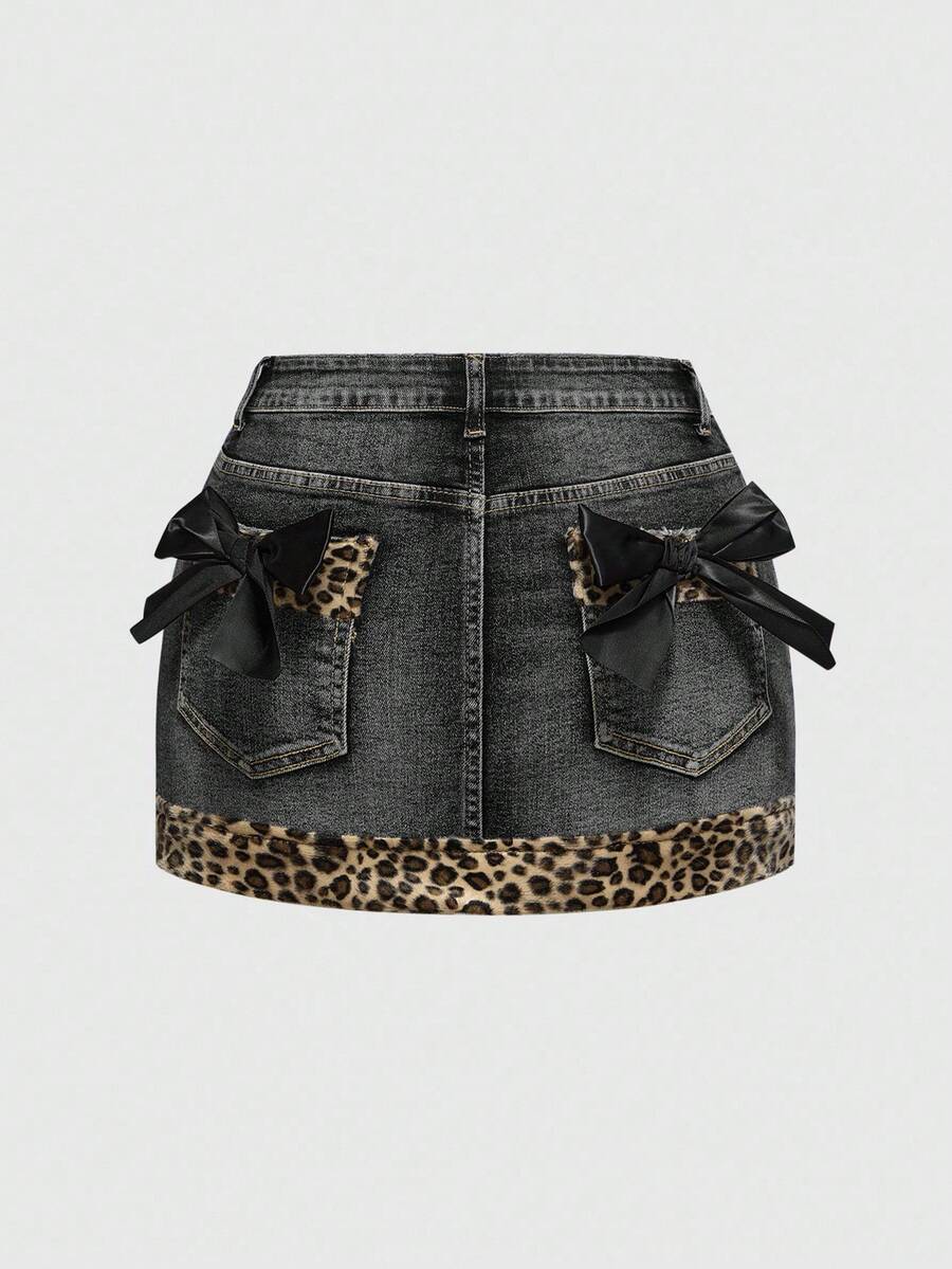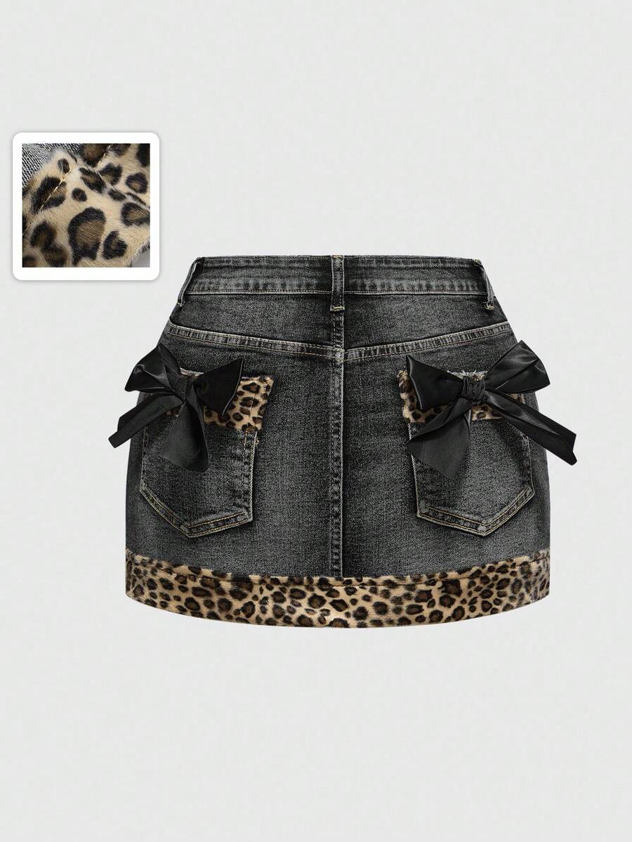 Kawaii Minifalda de mezclilla con parches de estampado de leopardo, lazo y estilo retro sexy subcultura Y2K para mujeres
