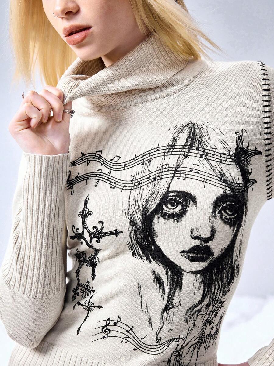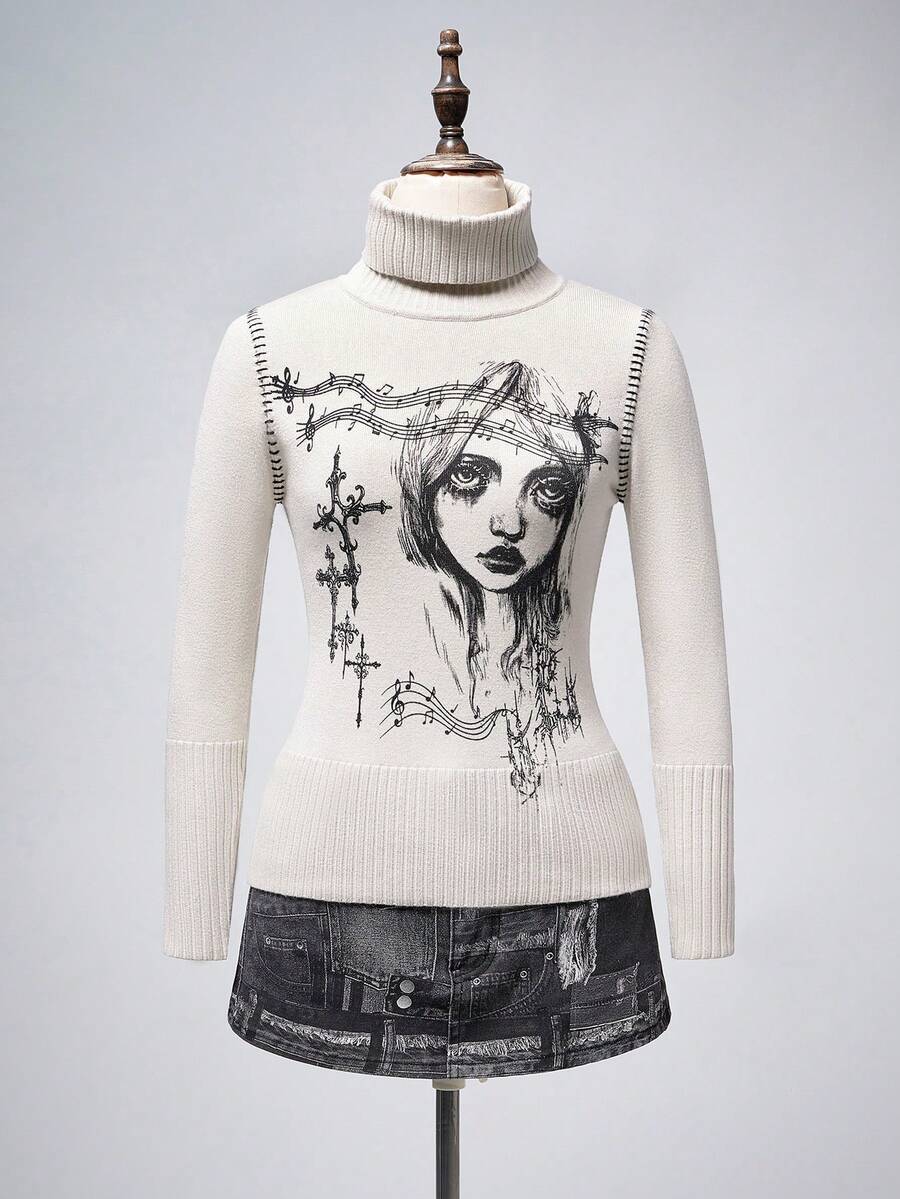 Suéter de cuello alto con estampado gráfico retro de subcultura ciberpunk para mujeres