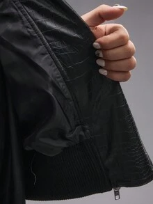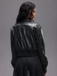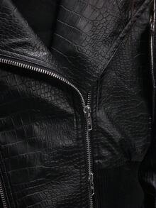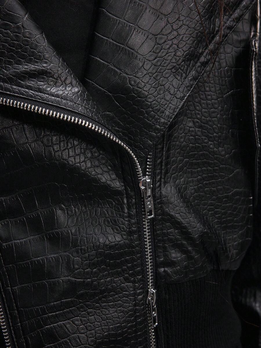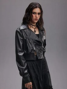 EDITION Chaqueta de motocicleta de cintura alta súper corta de piel de PU con cremallera decorativa y diseño deconstructivo y calado para mujeres
