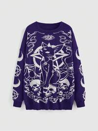 Goth Suéter holgado de talla grande con estilo gótico oscuro con estampado de gato negro, calavera, estrella, luna y serpiente en técnica de intarsia