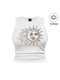 Fairycore Camiseta sin mangas con pliegues y estampado de sol, luna y estrellas para playa y vacaciones, talla grande